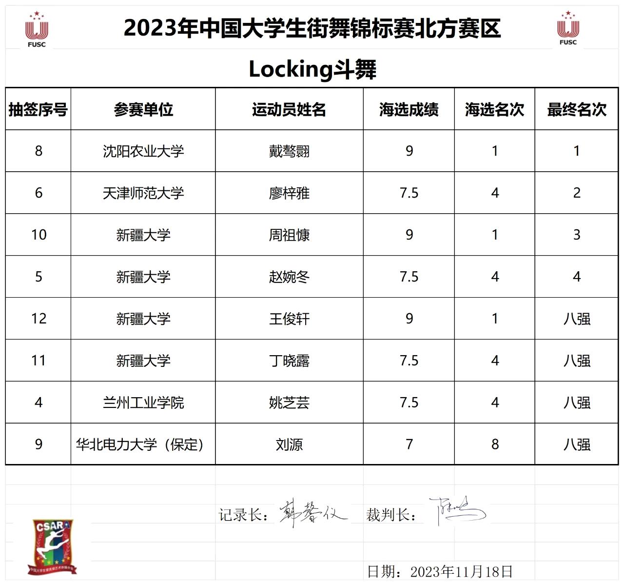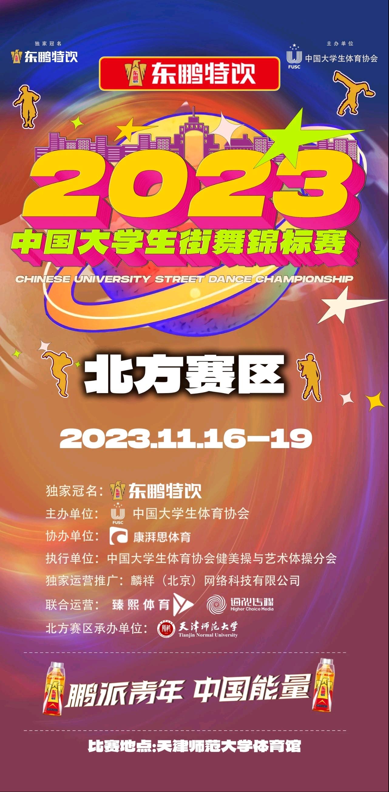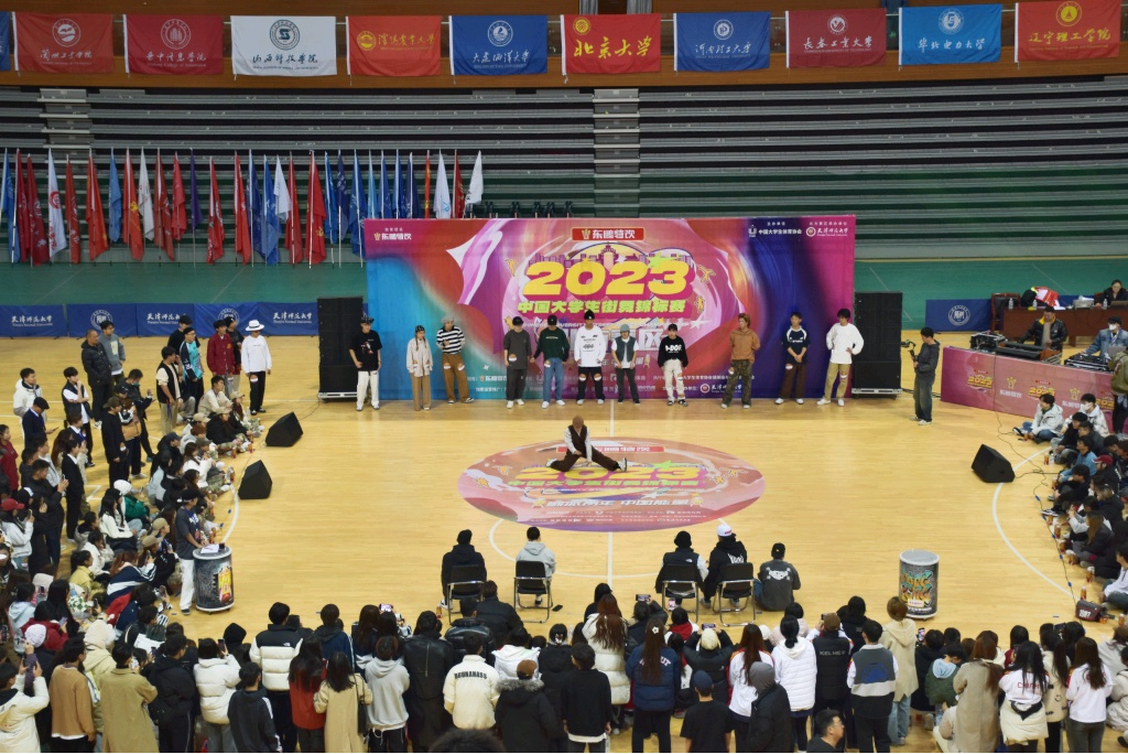 2023年11月16日至11月20日,中国大学生街舞锦标赛(北方赛区)在天津师范大学体育馆举办,来自北方50所高校代表队,近600名大学生舞者争相斗技、激情演绎了灵动活泼、刚劲顿挫的街舞之美。