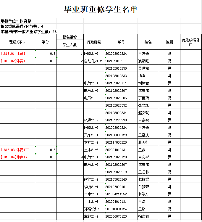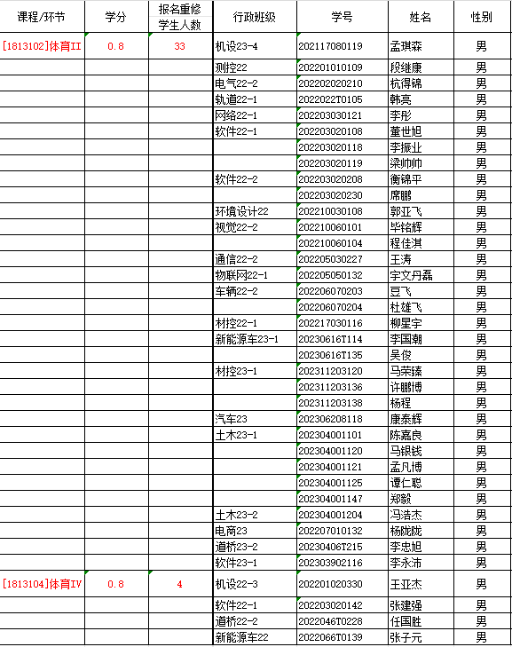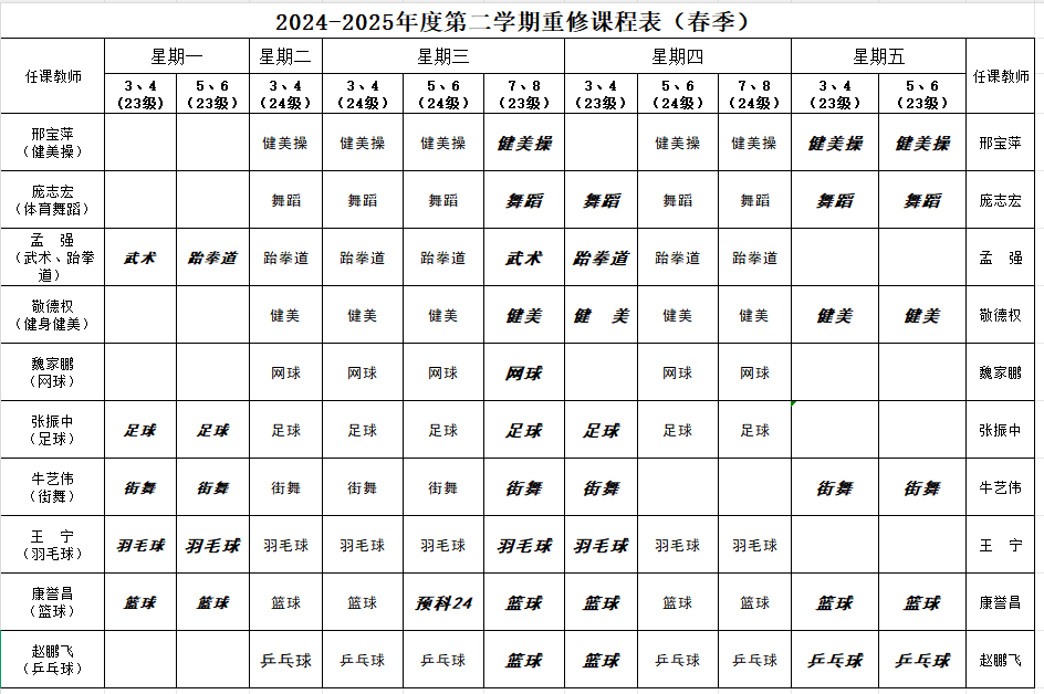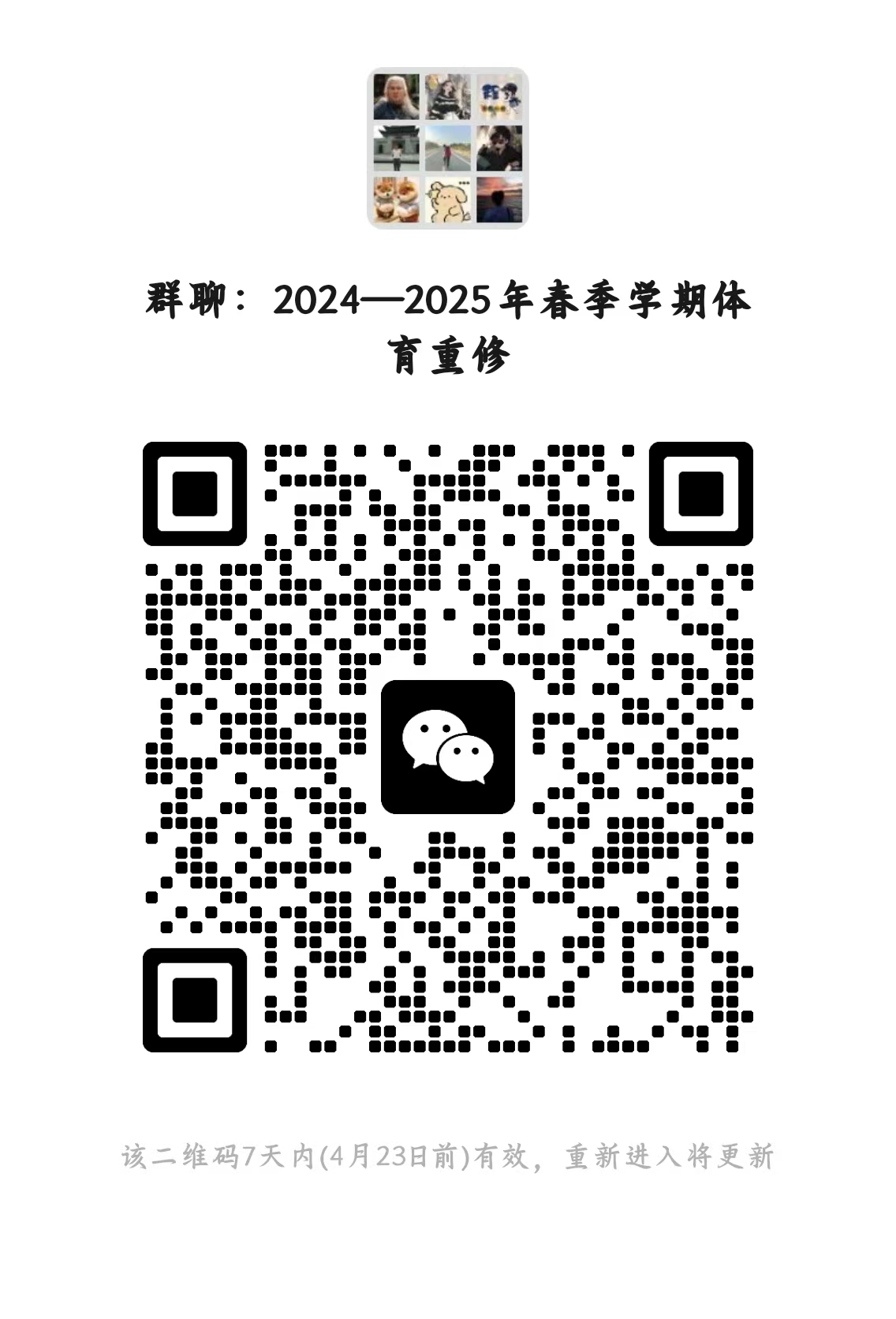 2024-2025学年第二学期体育重修通知 为做好2025年春季学期体育课程重修工作,现将有关事项通知如下: 毕业班——体育I、II、III、IV和非毕业班——体育II、体育IV重修内容均为各选项课程内容。 2.所有办理重修的学生,请加入微信群(实名+重修课程名称),涉及上课、考试的相关事宜都会在微信群里公布。 3.报名重修的学生按照微信群内安排,跟各选项重修教师进行上课与考试。 附件1:重修微信群二维码 附件2:重修学生名单 附件3:重修辅导老师课表 体育部 2025年3月25日 附件1: 附件2: